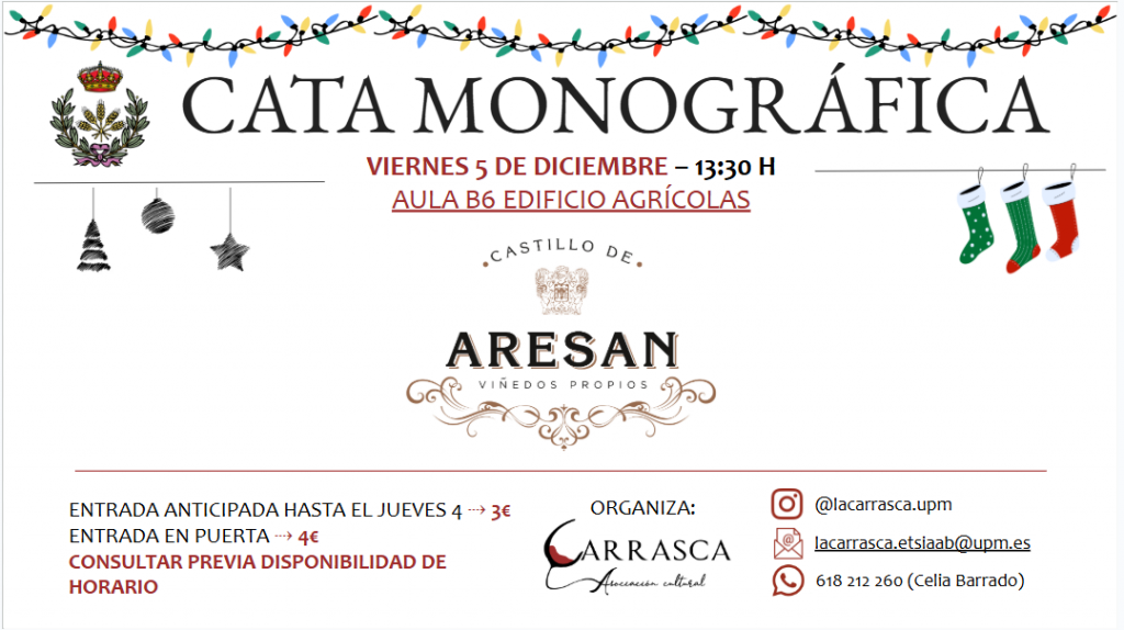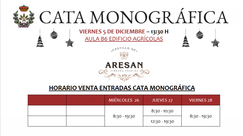 La cata se celebrará el día 5 de Diciembre a las 13.30 horas en el aula B6 del edificio de agrícolas de la Escuela Técnica Superior de Ingeniería Agronónmica, Alimentaria y de Biosistemas (E.T.S.I.A.A.B.).