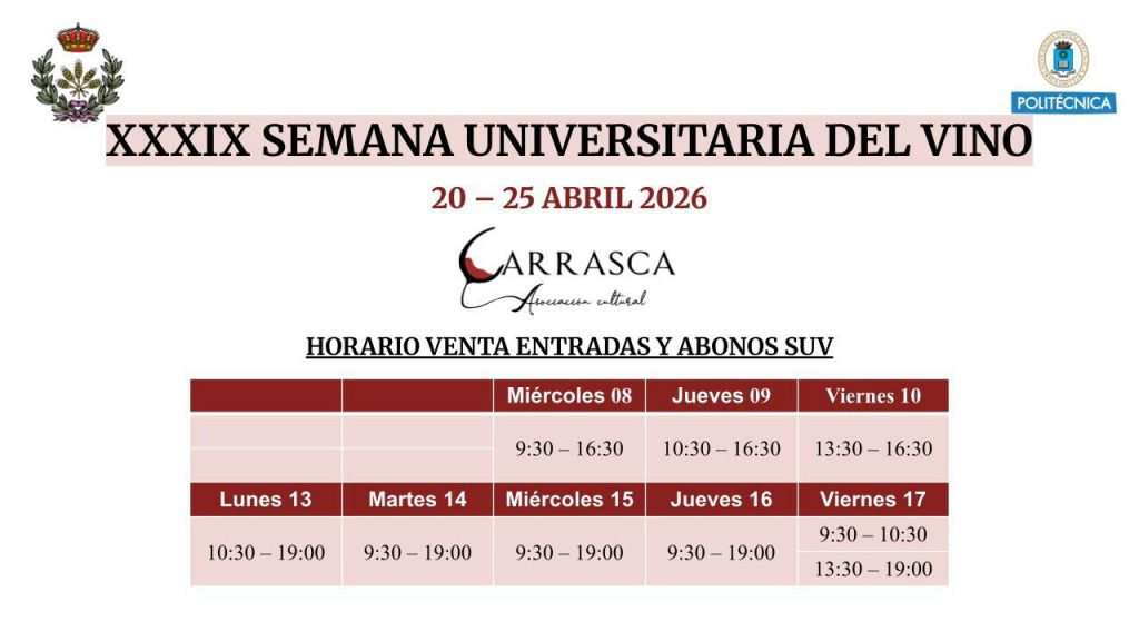 Este es el horario en el que podréis acercaros al local para pagar las entradas de la XXXIX Semana Universitaria del Vino.